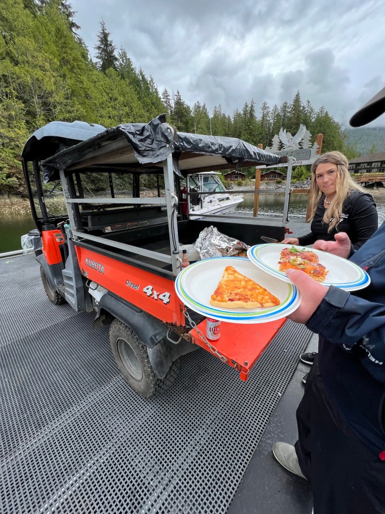 At 3pm all the boats arrive back at the dock and out comes the Kabota side-by-side with chicken wings and pizza. Music is playing and everyone is sharing their stories of the day while watching the professionals at work. The guides expertly clean and filet the fish while Sam Hauca and her amazing team portion the fish into vacuum sealed packages. Honestly for me my highlight is watching this well oiled machine impress everyone.