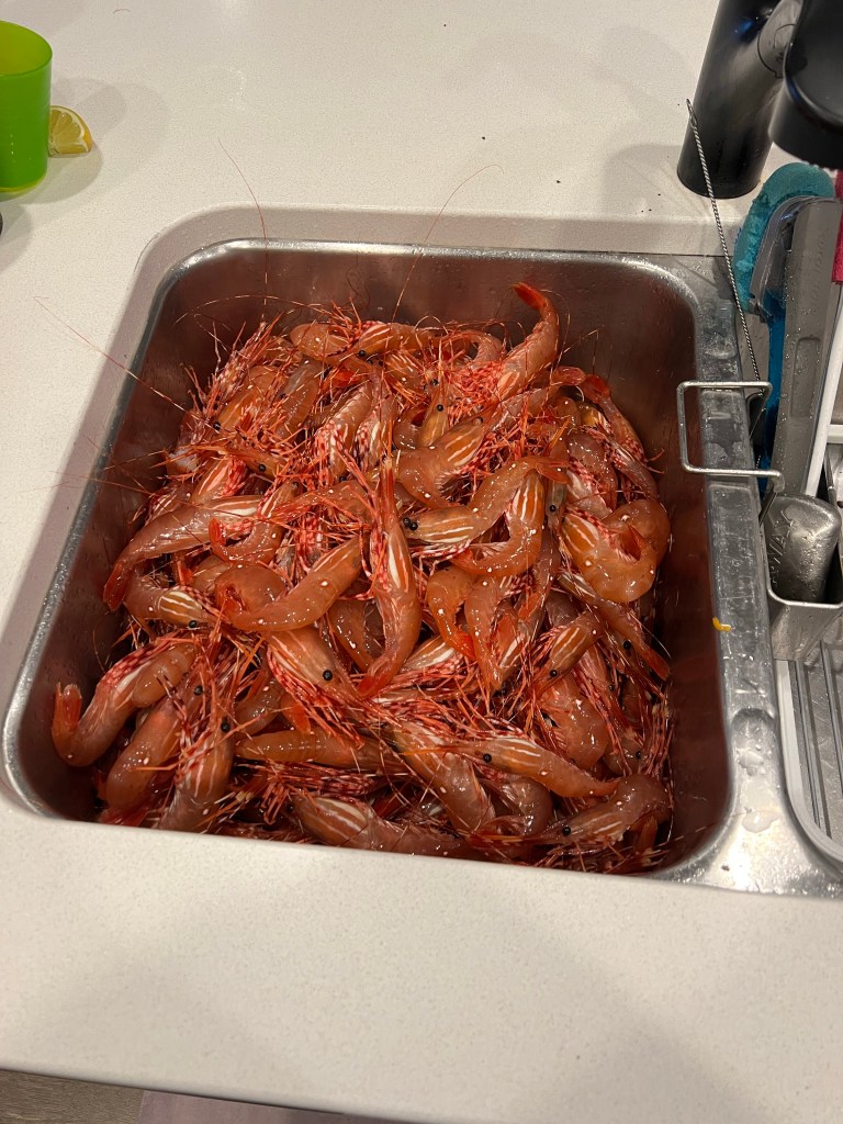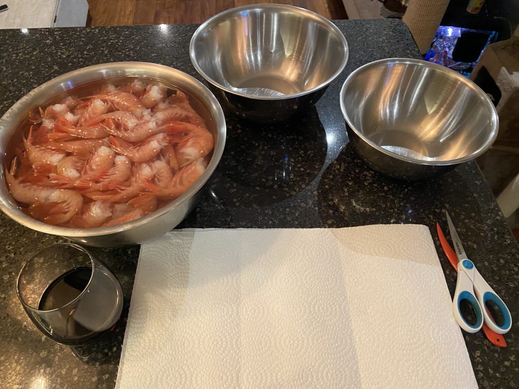 - Soak in salted ice water overnight: We freeze all of our prawns without their shells and deveined. On accident we discovered that if you soak the prawns (head off) overnight in icy salt water, the peeling process is remarkably easier. Day of the catch the prawn meat tends to stick to the shell and you can lose pieces of meat or just spend far too much time trying to separate the two. If you do the overnight fridge soak, the prawns will cleanly separate from the shell and quite often you can get the vein as you pull the shell.
