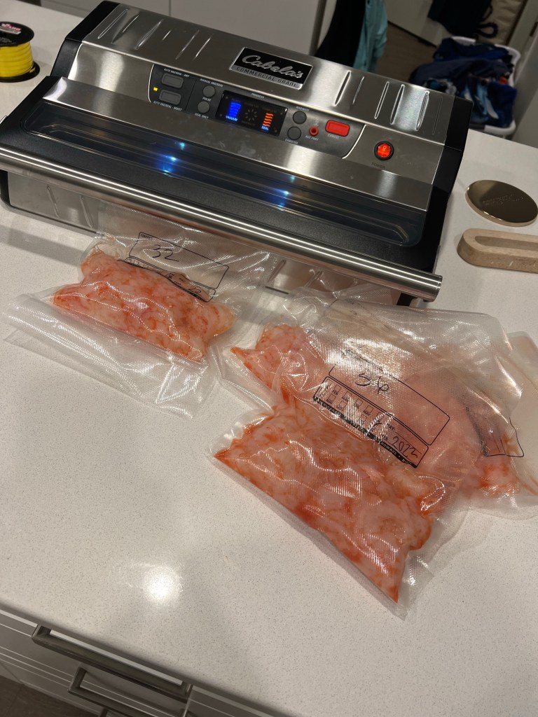 - De-head sooner rather than later: The longer you wait to take the heads off the softer the meat will get due to the enzyme they release. I know some people keep them in the cold water for a bit so they flush out anything in their system first. We will do this as well but like to do the heads within 45 minutes. I am also very picky so part of my process is taking the veins out before freezing anyway.